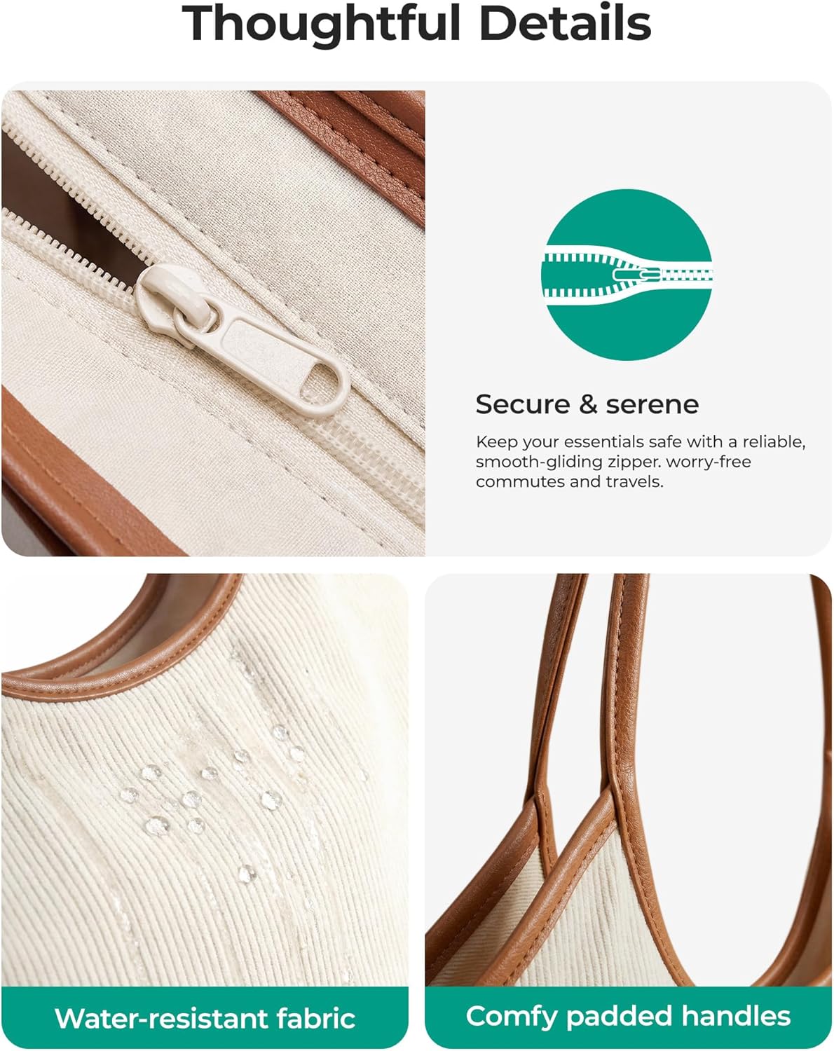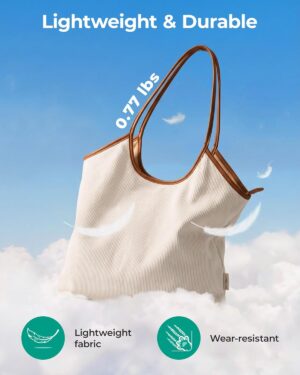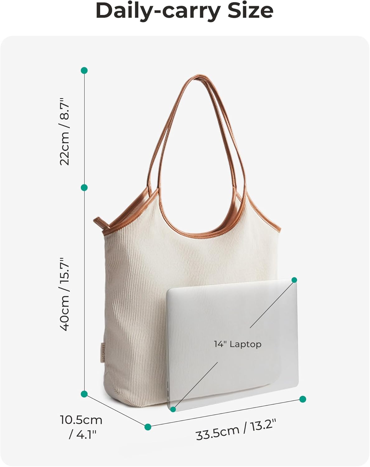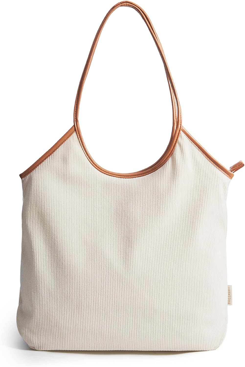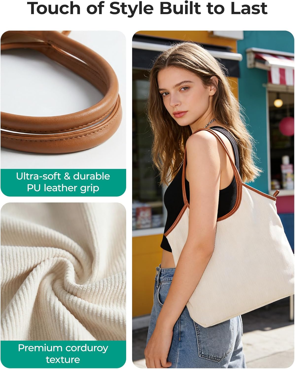 Cream Corduroy Shoulder Tote Bag with Brown Trim