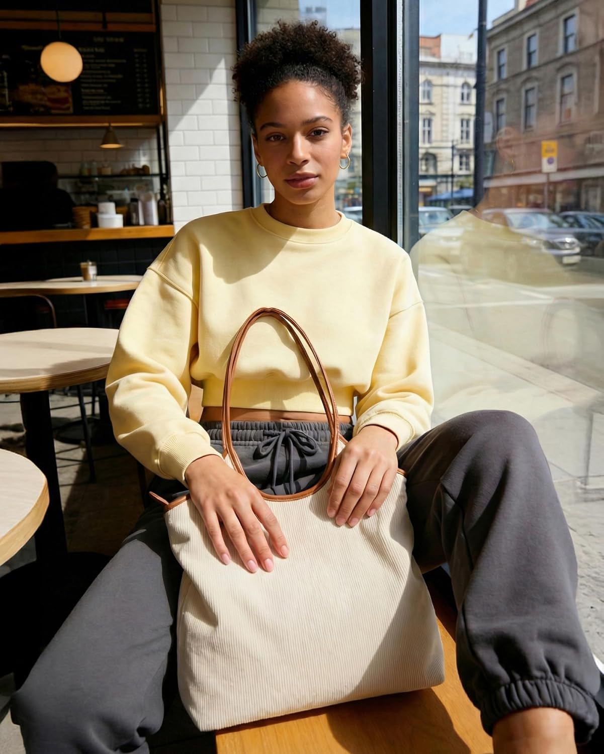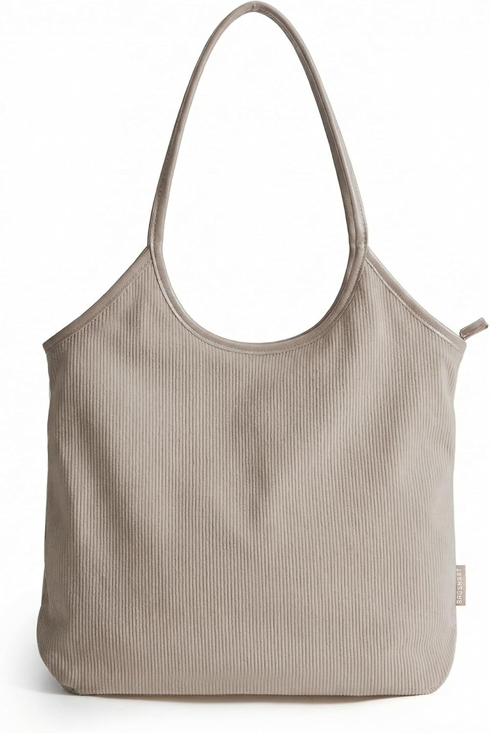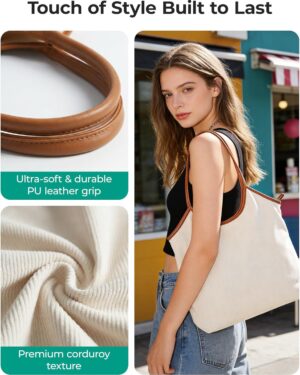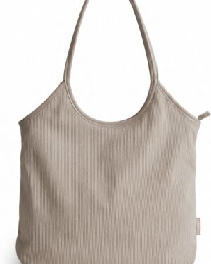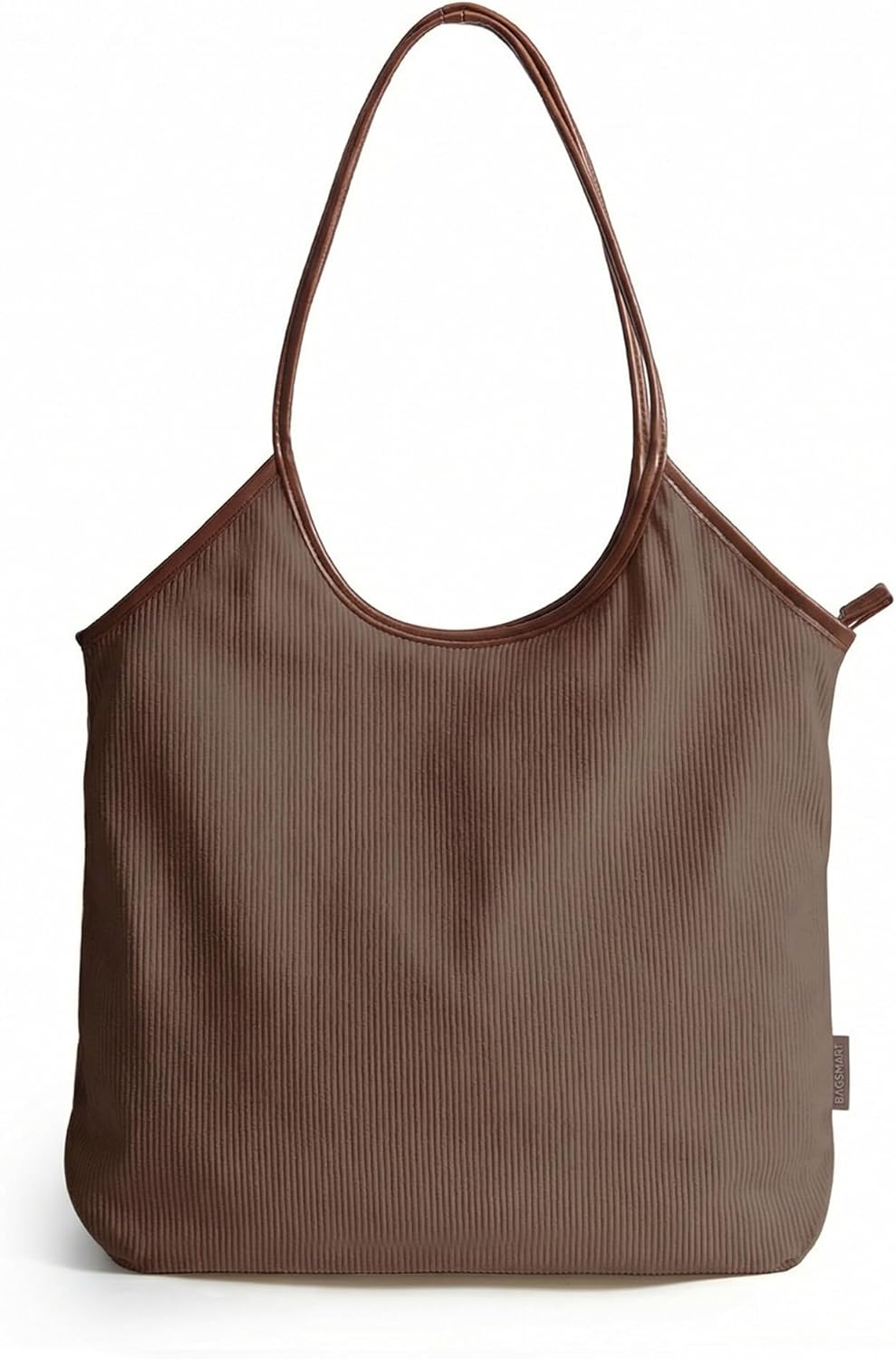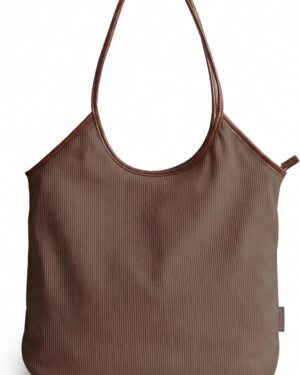 This versatile cream corduroy shoulder tote bag offers a blend of casual style and practicality. The bag features a soft, ribbed corduroy fabric in a light cream hue, complemented by smooth brown trim that outlines the top edge and forms the comfortable shoulder strap. Its relaxed yet structured silhouette makes it suitable for various daily activities, from carrying essentials for a casual outing to serving as a lightweight everyday handbag. The design suggests a spacious interior, ideal for those who need to carry more than just the basics. This tote is a great choice for individuals seeking a simple, understated accessory with a touch of classic texture.