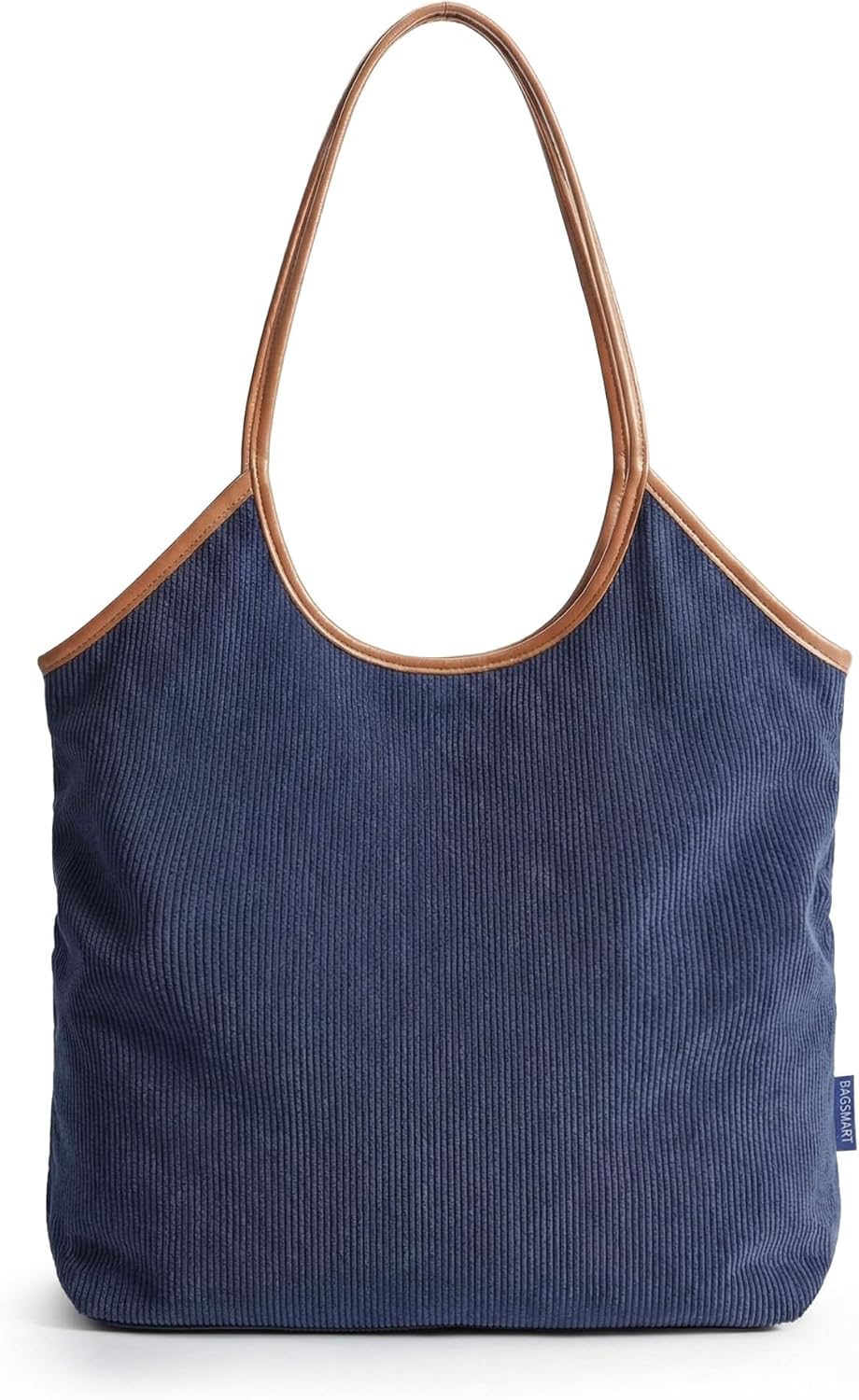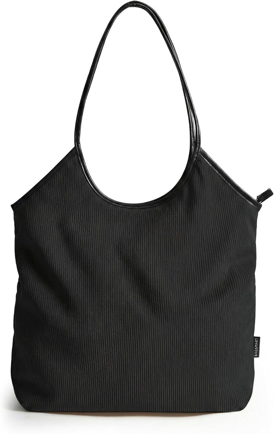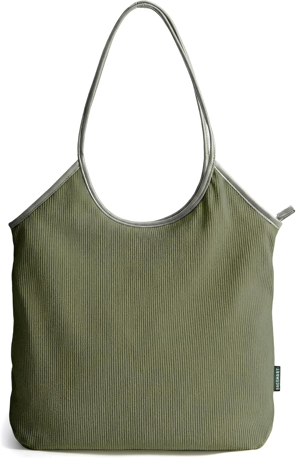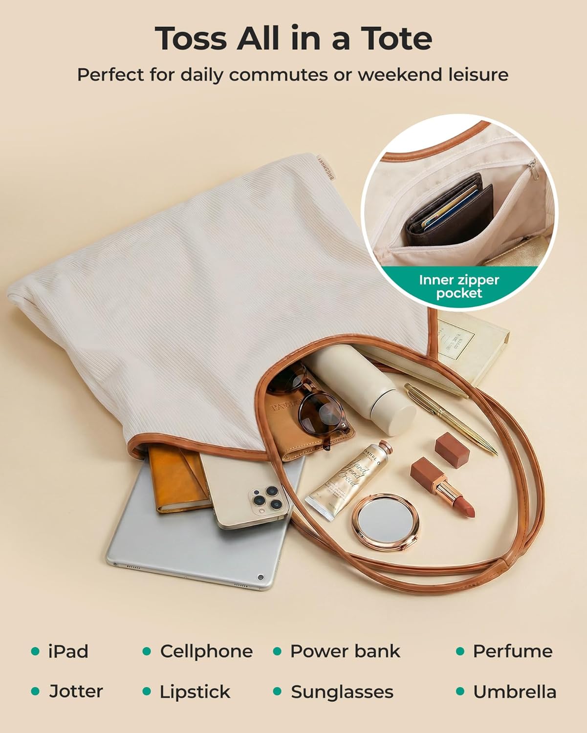 This versatile cream corduroy shoulder tote bag offers a blend of casual style and practicality. The bag features a soft, ribbed corduroy fabric in a light cream hue, complemented by smooth brown trim that outlines the top edge and forms the comfortable shoulder strap. Its relaxed yet structured silhouette makes it suitable for various daily activities, from carrying essentials for a casual outing to serving as a lightweight everyday handbag. The design suggests a spacious interior, ideal for those who need to carry more than just the basics. This tote is a great choice for individuals seeking a simple, understated accessory with a touch of classic texture.