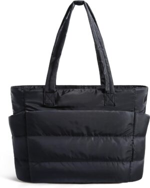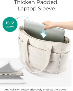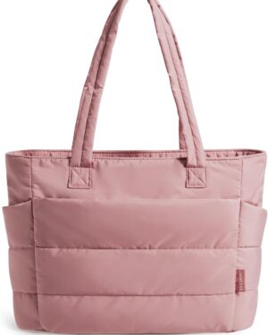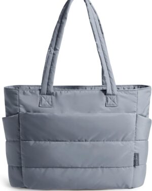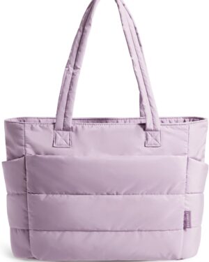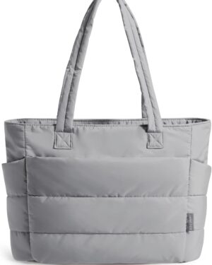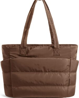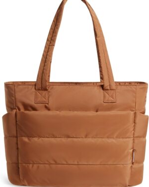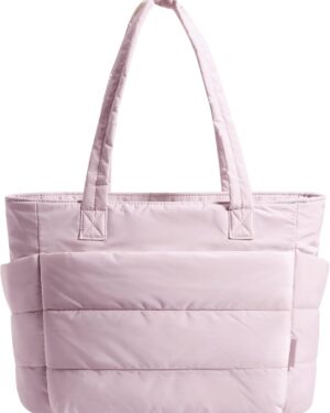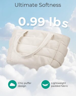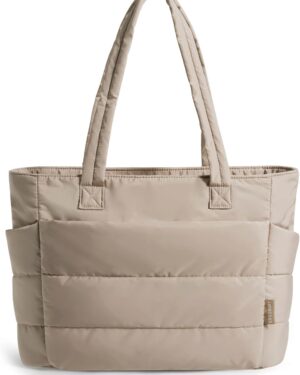 This cream-colored tote bag features a distinctive quilted, puffy design, giving it a soft and voluminous appearance. It is equipped with two sturdy shoulder straps, making it comfortable for everyday carry. The bag’s design includes visible exterior pockets on the front, suggesting practical storage for various items. Its neutral hue and casual yet stylish aesthetic make it suitable for a variety of occasions, from daily commutes to casual outings or even as a lightweight option for gym essentials. The spacious interior, though not visible, is implied by its tote style, catering to individuals who need to carry multiple items while maintaining a fashionable look.
