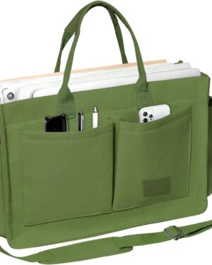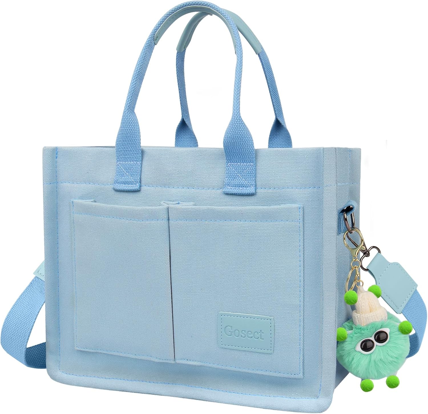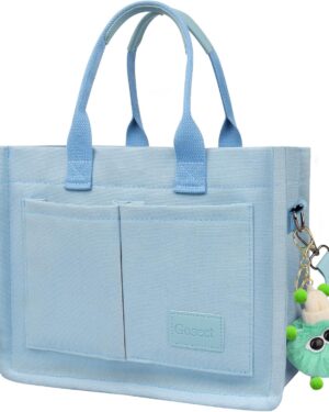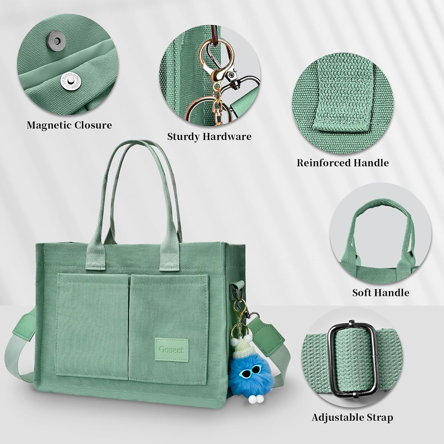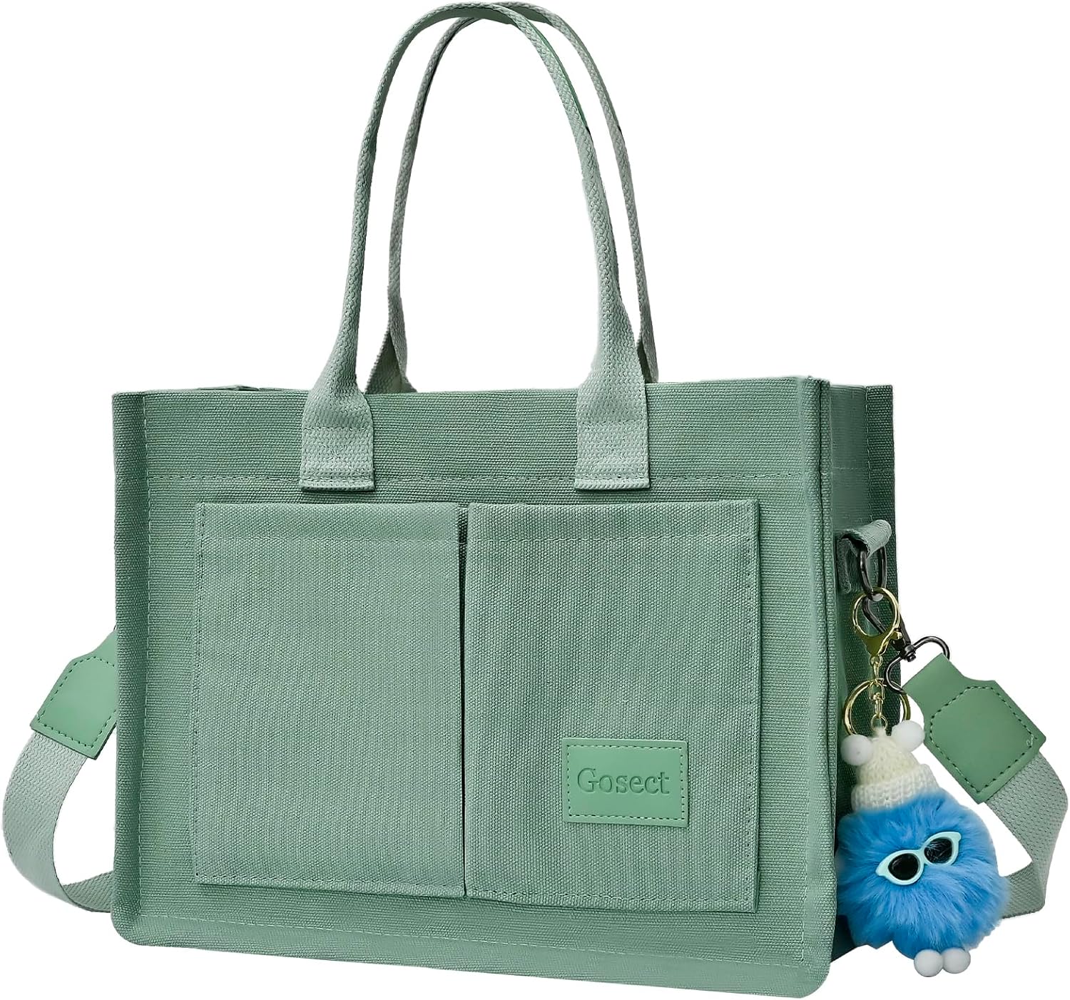 This versatile mint green canvas tote bag is designed for everyday use, offering both style and practicality. It features a spacious main compartment, ideal for carrying essentials like a laptop, books, or daily necessities. The exterior is equipped with two prominent front pockets, providing easy access storage for smaller items. The bag includes sturdy top handles for hand carrying and a detachable, adjustable shoulder strap, allowing it to be worn as a crossbody or shoulder bag. The durable canvas material makes it suitable for various occasions, from work and school to casual outings. Its minimalist design, accented by a small brand patch, appeals to individuals seeking a functional yet fashionable accessory.